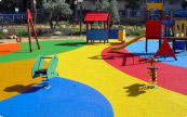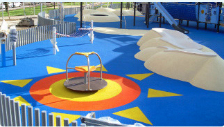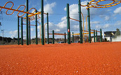 現場施工での投手ゴムチップアンダーバットとカラーゴムチップの組み合わせにより、遊具の高さに応じたHIC値を満たした性能を有するシステムです。